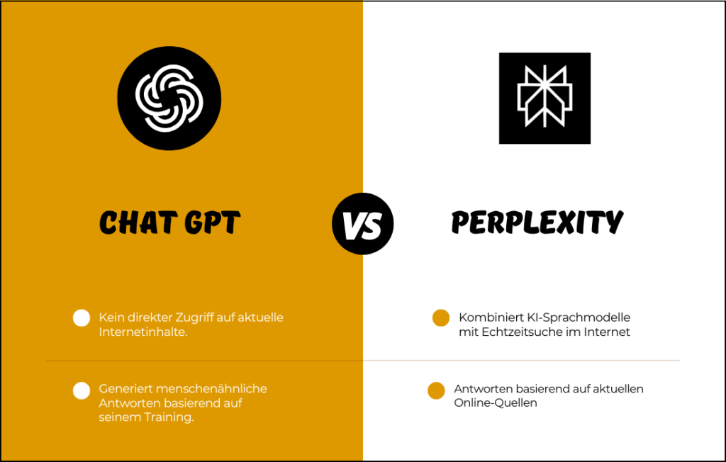 - Perplexity hingegen kombiniert KI-Sprachmodelle mit Echtzeitsuche im Internet. Es liefert Antworten basierend auf aktuellen Online-Quellen und zitiert diese direkt.