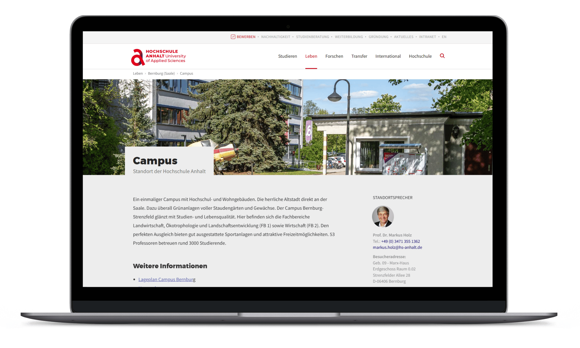 Die Hochschule Anhalt beraten wir umfassend in allen digitalen Bereichen. Von gezielten Social-Media-Strategien bis hin zu Webdesign-Maßnahmen. Dabei unterstützen wir nicht nur konzeptionell, sondern übernehmen bei Bedarf auch die praktische Umsetzung, unteranderem beim Gründerzentrum der HS Anhalt.