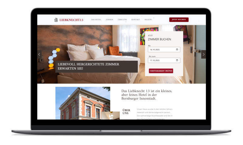 Für das Bernburger Hotel Liebknecht13 wurde eine neue Webseite entwickelt, Buchungssystem integriert und Schnittstellen zu verschiedenen Software Anbieter sichergestellt. Zusätzlich wurden Fotoaufnahmen von den neuen Räumlichkeiten angefertigt.