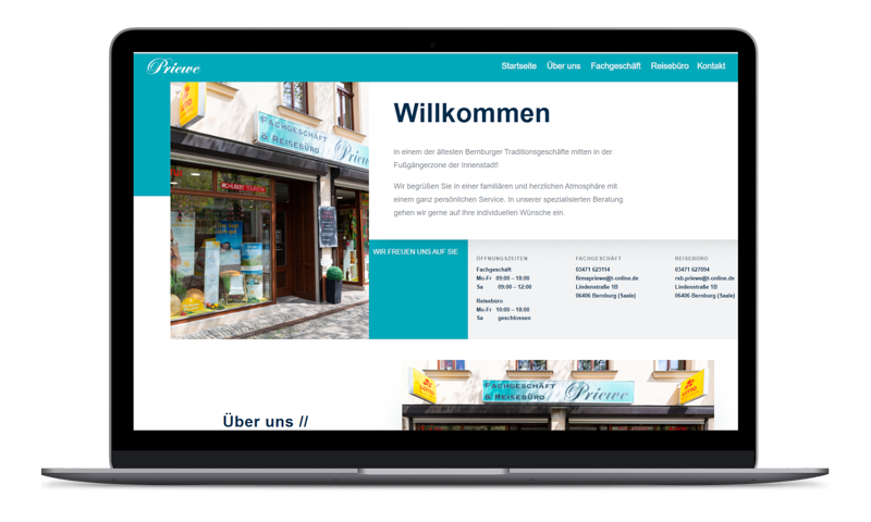 Das Bernburger Traditionsgeschäft Priewe vereint Reisebüro mit Fachgeschäft. Für das Unternehmen wurde ein einfacher Onepager als digitale Visitenkarte.