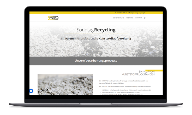 Sonntag Recycling ist spezialisiert auf die Kunststoffaufbereitung. Für das Unternehmen wurde ein Onepager erstellt, um die wichtigsten Informationen zum Unternehmen auch digital sichtbar zu machen.